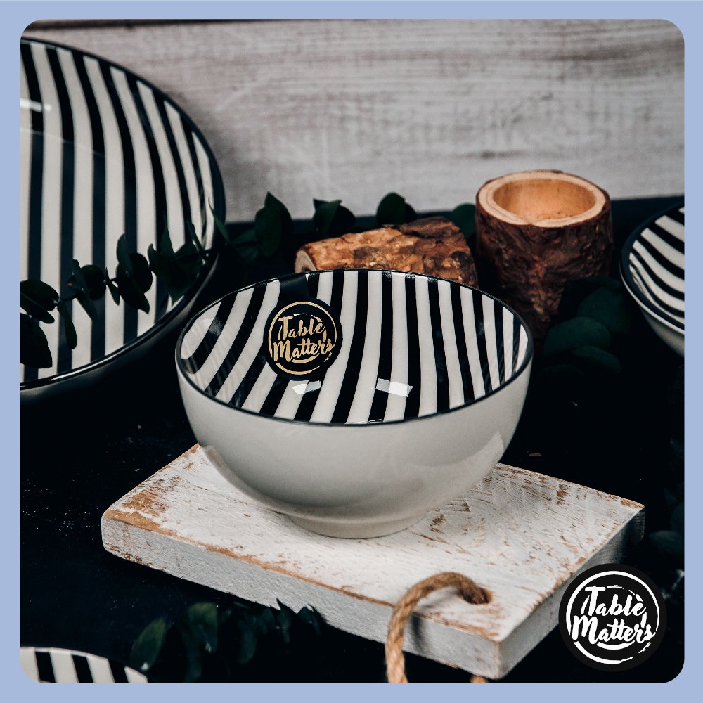 Drawing inspiration from the timeless allure of French Breton stripes. the BonBon Stripes is a blend of simplicity and grace. When paired with the complementary BonBon Dots Collection. your Table becomes an artwork with contrasting patterns that are endlessly stylish. The striking black and white design doesn’t just add to the aesthetics. Still. recent studies indicate that dishes with less contrast to the food intensify the dining experience. making every bite irresistibly delightful.