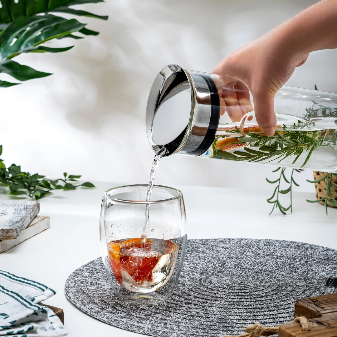 This sleek and seamless carafe boasts a stunning 360-degree pour. eliminating drips and ensuring a mess-free experience.