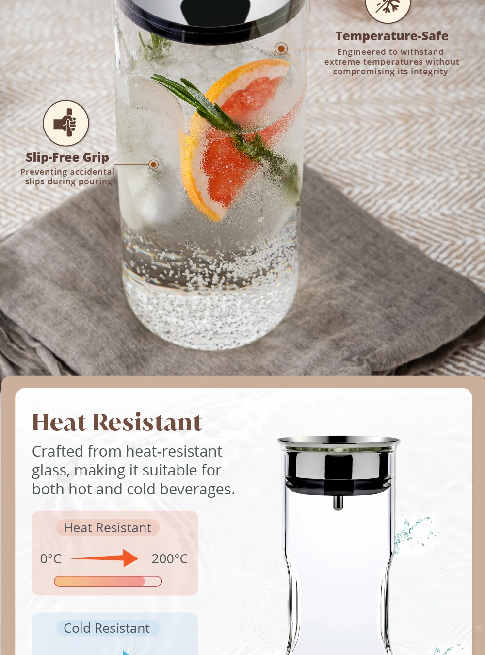 • Heat-Resistant Glass: Enjoy versatility! This carafe is crafted from heat-resistant glass. making it suitable for both hot and cold beverages.