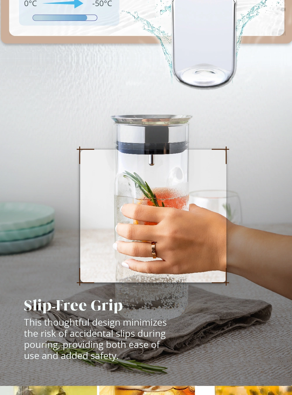 • Ergonomic. Slip-Free Grip: The carafe’s sides are thoughtfully designed to fit comfortably in your hand. preventing accidental slips during pouring.