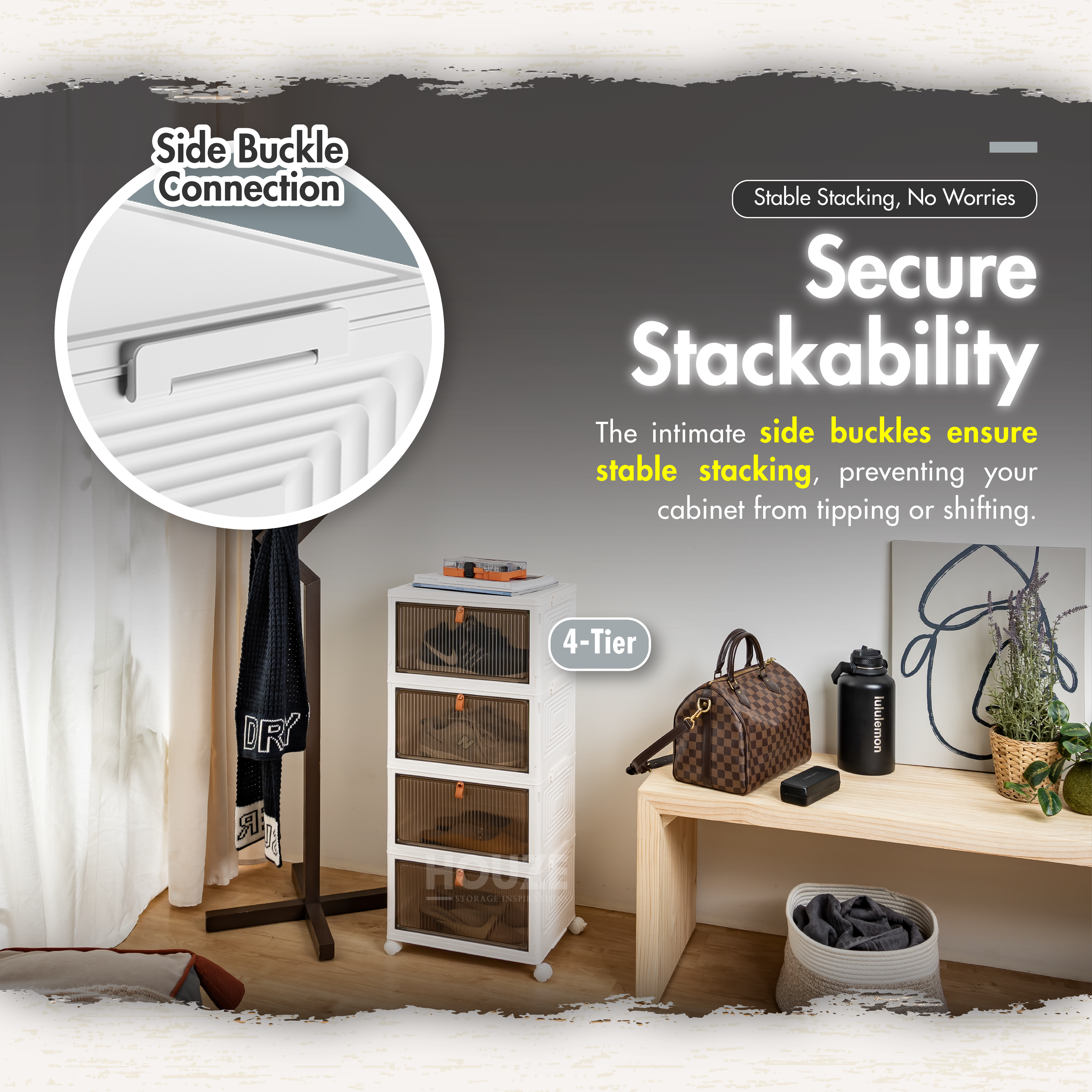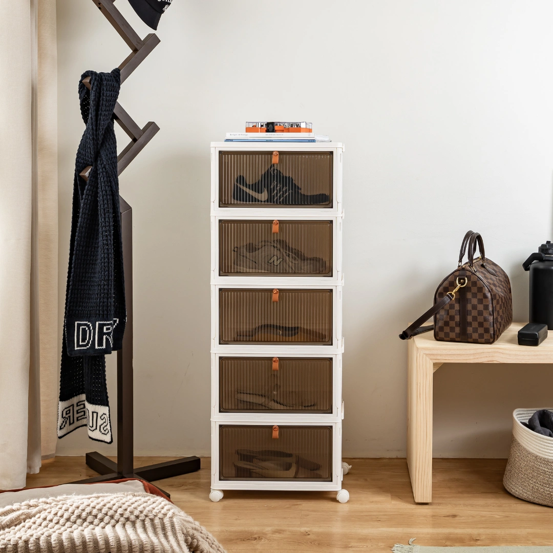 Discover the HOUZE DROPBOXX. your ideal shoe storage solution! Compact and foldable. this single or multi-tier cabinet is made from durable materials. keeping your shoes safe from dust and moisture. Its magnetic latch and semi-transparent door make it a breeze to use. Plus. its wheels make moving around easy. Perfect for any modern Singapore home. the SoleMate is stylish and practical!