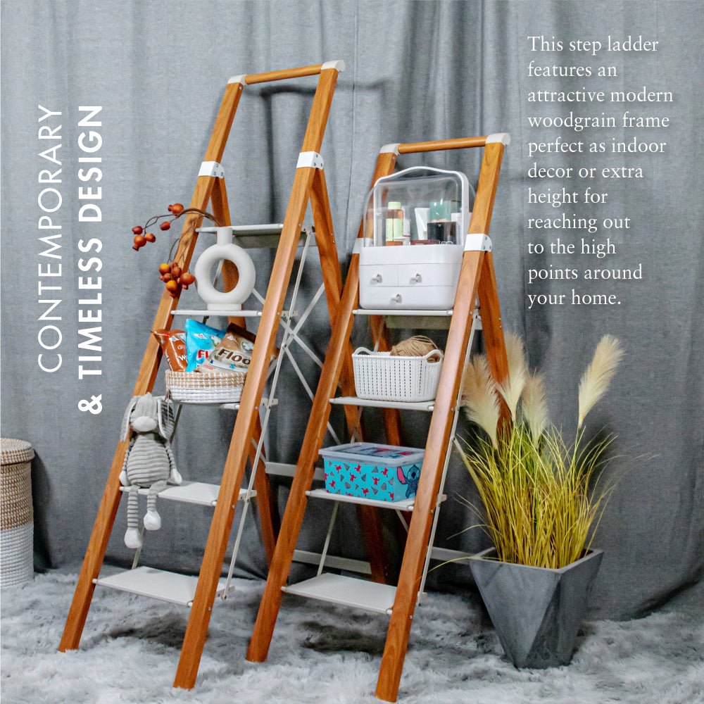 The HOUZE – LIFE Woodgrain 4/5 Tier Ladder isn’t just about reaching those high shelves and elevating every moment. Whether changing a lightbulb. retrieving your favourite book. or draping fairy lights for a festive mood. this ladder is your partner. Its spacious steps ensure comfort. while the solid anti-slip bases guarantee safety. Crafted from enduring aluminium. investing in this ladder promises longevity.