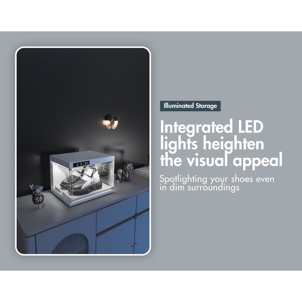 The SoleMate IllumiCube is not just any shoe display; it’s a testament to the ultimate combination of functionality and elegance. Each box is crafted with the unparalleled strength of Acrylonitrile Butadiene Styrene (ABS) and Polycarbonate (PC). ensuring durability and a sleek finish. Including LED lights takes this piece a notch higher. allowing your prized footwear to shine in all its glory.