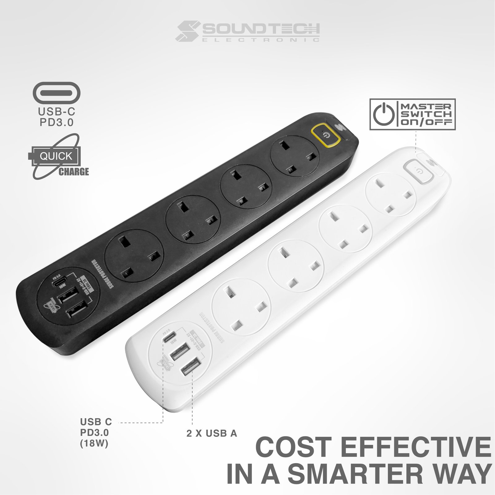 SOUNDTECH - 4Ways 2Metres Extension Socket with USB A+C. BLACK | WHITE